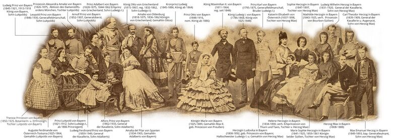 Vier Generationen des Hauses Wittelsbach im Wintergarten der Münchner Residenz. Das Bild entstand als Collage nach einzelnen Porträtaufnahmen. Mit Ausnahme König Max I. Joseph (reg. 1799-1825) sind auf diesem Bild alle Herrscher des Königreiches Bayern versammelt. Collage von Josef Albert (1825-1886), um 1863. Gestaltung: Stefan Schnupp (bavarikon) (© Bayerische Schlösserverwaltung)