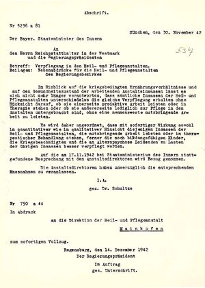 In dieser für viele Anstaltsbewohner prekären Lebenssituation wurde der bayerische Hungerkosterlass verabschiedet: Auf Einladung des Leiters der Abteilung Gesundheitswesen im Innenministerium, Dr. Walter Schultze (NSDAP, 1894–1979), einem engagierten Verfechter der rassistisch orientierten eugenischen Ideologie und Organisator der Vernichtungsaktion T-4 in Bayern, versammelten sich am 17. November 1942 die Direktoren der bayerischen Heil- und Pflegeanstalten in München. Thema war die Ernährungssituation in den psychiatrischen Anstalten. Valentin Faltlhauser (1876–1961), Direktor der psychiatrischen Anstalt in Kaufbeuren-Irsee und seit Mitte der Weimarer Republik bedeutender Anstaltspsychiater, der ein engagierter Befürworter des Zwangssterilisationsgesetzes war und als Gutachter während der ersten Vernichtungsaktion T-4 fungiert hatte, referierte über seine Erfahrungen bei der Verabreichung von Hungerkost in seiner Einrichtung. Anschließend wurde festgelegt, nur noch den arbeitsfähigen Patienten eine vollwertige Kost zu gewähren. Die arbeitsunfähigen und die vermeintlich nicht mehr therapierbaren Patienten sollten eine fett- und fleischlose Kost mit wenig Kohlehydraten erhalten, an der sie nach einigen Wochen zugrunde gehen würden. Im Nachgang dieser Besprechung verfügte das Innenministerium am 30. November 1942 den bayerischen Hungerkosterlass: „Es wird daher angeordnet, dass mit sofortiger Wirkung … diejenigen Insassen der Heil- und Pflegeanstalten, die nutzbringende Arbeit leisten oder in therapeutischer Behandlung stehen, ferner die noch bildungsfähigen Kinder, die Kriegsbeschädigten und die an Alterspsychose Leidenden zu Lasten der übrigen Insassen besser verpflegt werden“.