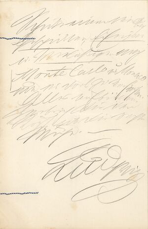 Kammerbefehl König Ludwigs II. von 1885/86, in welchem er anordnete, einen "Verlässigen" nach Monaco und Monte Carlo zu entsenden, um dort Geld aufzutreiben. (Bayerisches Hauptstaatsarchiv, Geheimes Hausarchiv, Ministerium des Königlichen Hauses 193)