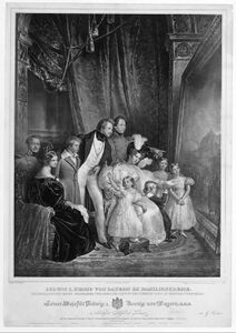 König Ludwig I. (1786-1868) im Familienkreis bei Betrachtung des Gemäldes mit dem Einzug Ottos (1815-1867) in Nauplia. Lithografie von Gottlieb Bodmer (1804-1837) nach Dietrich Monten (1799-1843), 1835. (Bayerische Staatsbibliothek, Bildarchiv port-006172)