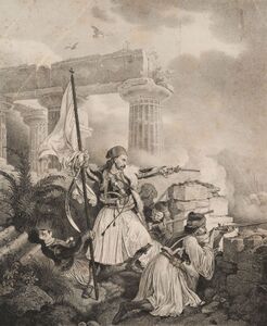 „Ein Kapitän mit seinen Pallikaren im Gefechte“, 1829. Zeichnung: Karl Krazeisen (1794-1878), Lithografie: Peter von Hess (1792-1871). (Münchner Stadtmuseum, Sammlung Graphik / Gemälde lizenziert durch CC BY-SA 4.0)