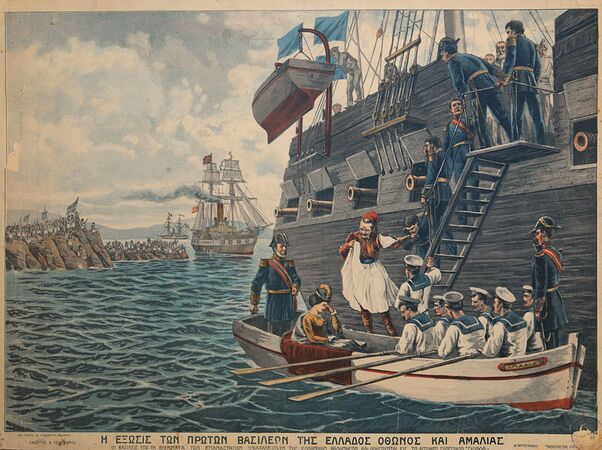 Lithographische Darstellung der Abreise von König Otto (1815-1867) und Königin Amalie (1818-1875) aus Griechenland, 1862. (Gemeinfrei via Wikimedia Commons)