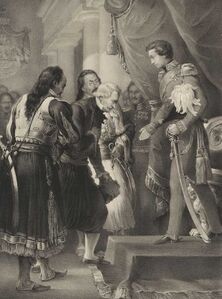 „Die griechischen Deputierten huldigen ihrem Könige“, Lithographie von Johann Baptist Kuhn (1810-1861), um 1845 nach Peter von Hess (1792-1871). (Münchner Stadtmuseum, Sammlung Graphik / Gemälde lizenziert durch CC BY-SA 4.0)