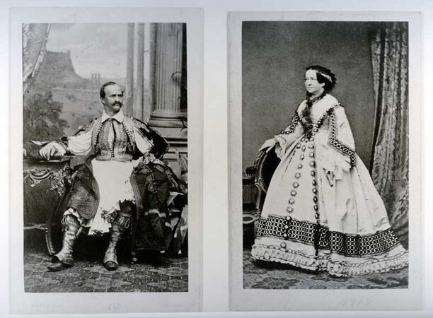 König Otto (1815-1867) in griechischer Nationaltracht und Königin Amalie (1818-1875) in der von ihr kreierten „Amalientracht“, Foto von Joseph Albert (1825-1886), München 1860. (© Bayerische Schlösserverwaltung, Lucinde Weiss, München)
