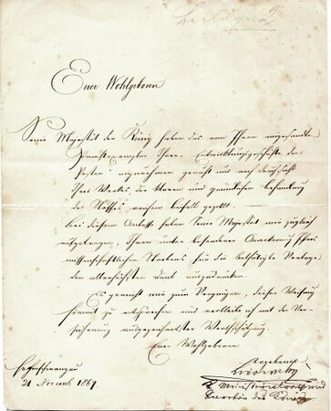 Brief des Kabinettssekretärs Felix Friedrich Ritter von Lipowsky (1824-1900) an den Autoren und Offizials bei den kgl. Verkehrsanstalten Münchens Eugen Hartmann, Hohenschwangau 21.11.1869. Im Namen König Ludwigs II bedankt sich Lipowsky für die Übersendung eines Exemplares seines Buch "Geschichte der Posten" und richtet ein Lob für das Werk aus. (gemeinfrei via Wikimedia Commons)