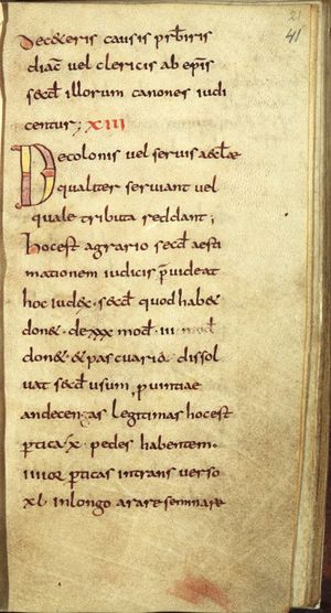 Legt man die in diesem Punkt singulären Bestimmungen der bairischen Lex (um 740) zugrunde, so zeigen die zu erbringenden Leistungen, wie eine kirchliche Kolonenwirtschaft in den Herrenhof eingebunden war: Demnach mussten die Kolonen 10 % der Felderträge sowie weitere Naturalabgaben dorthin abführen, dort auch ein – in fränkischen Maßeinheiten – definiertes Feldstück vom Pflügen bis zur Ernte bestellen, Mahd, Boten- und Waffendienste (Metz) sowie differenzierte Fuhrdienste (Scharwerk), u. a. zum Unterhalt von Wirtschaftsgebäuden, leisten (MGH LL nat.germ. 5,2, S. 286-290). Bezeichnenderweise fehlten bei den freieren Kolonen unbeschränkte Arbeiten (z. B. Tagedienste, in der Regel als "Drei-Tages-Fron") auf dem Herrenhof. Sie bleiben den Knechten ("servi ecclesiastici") vorbehalten. Beide Gruppen leisten nach Maßgabe eines Verwalters ("iudex") und sollen nicht ungebührlich ("iniuste") belastet werden.