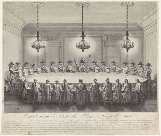 Symbolische Darstellung der Beeidigung der Rheinbundakte durch Napoleon (1769-1821) und die 15 konföderierten Fürsten auf einer Illustration von Thomas Charles Naudet (1773-1810), 1806. (Rijksmuseum, gemeinfrei via Wikimedia Commons)