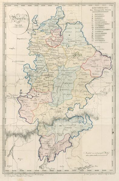 Karte Bayerns von 1808. Sie zeigt die Einteilung des Landes in 15 Kreise, wie sie durch die Konstitution (Tit. I, § 4) neu geregelt wurde. (Bayerische Staatsbibliothek, Mapp. XI, 49 ab)