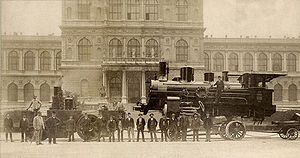 Die Maffei-Lokomotiven wurden von der Hirschau durch den Englischen Garten mit achtspännigen Tiefladern zum Münchner Hauptbahnhof transportiert. Dieses Bild zeigt einen Transport vor der Akademie der Bildenden Künste im Jahre 1896. (Stadtarchiv München, AB_Erg_0185)