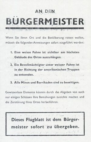 Bis in die letzten Kriegstage wurden von deutschen Soldaten allerdings immer wieder an Flüssen oder Anhöhen neue Verteidigungslinien bezogen und Ortschaften provisorisch befestigt. In der Regel wurden diese Stellungen aber, bestenfalls nach kurzen Feuergefechten, schnell aufgegeben. Lokale Honoratioren (nicht selten in Stellvertretung der NS-belasteten Bürgermeister) erreichten vielfach den Rückzug deutscher Truppen aus ihren Gemeinden und führten eine kampflose Übergabe herbei. Wenn dies nicht gelang und Widerstand geleistet wurde, oft von der Waffen-SS und jungen Soldaten oder Hitlerjungen ausgehend, führte dies zu erheblichen Zerstörungen durch Beschuss von Tieffliegern und Artillerie sowie abschließendem Sturm durch Bodentruppen (z.B. in Karlstadt am Main, Kirchenlamitz, Gunzenheim).