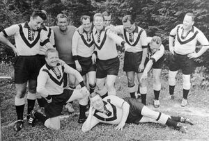 Gruppenbild des FC Schmiere bei einer Reportage über Maxl Graf, 8. Oktober 1967 (v.l.n.r.): Maxl Graf (1933–1996), Unbekannt (verdeckt von Graf), Hans-Jürgen Diedrich (1923–2012; kniend), Franz Muxeneder (1920–1988), Sammy Drechsel (1925–1986), Fred Kassen (liegend), Jürgen Scheller (1922–1996), Horst Jüssen (1941–2008), Dieter Hildebrandt (1927–2013), Unbekannt, Ludwig Maibohm (1914–1997; ganz rechts). Foto von Georg Fruhstorfer (1915-2003). (Bayerische Staatsbibliothek, Bildarchiv fruh-02793)