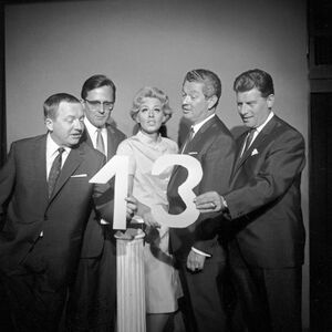 Reportage Münchner Lach- und Schießgesellschaft bzw. 13. Programm „Die Pharisäer proben den Notstand“, Mai 1966 (v.l.n.r.): Hans-Jürgen Diedrich (1923–2012), Dieter Hildebrandt (1927–2013), Ursula Noack (1918–1988), Klaus Havenstein (1922–1998), Jürgen Scheller (1922–1996). Foto von Georg Fruhstorfer (1915-2003). (Bayerische Staatsbibliothek, Bildarchiv fruh-03902)