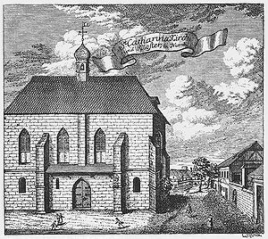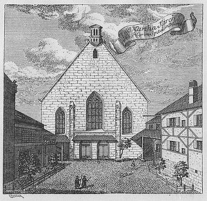 Stich der Kirche St. Martha in Nürnberg von Christoph Melchior Roth (1720-1798). Die ehemalige Pilgerkirche diente nach der Reformation bis 1614 als Aufführungsraum für die Nürnberger Meistersinger. Abb. aus: Hugo Barbeck, Alt-Nürnberg, Kulturgeschichtliche Bilder aus Nürnbergs Vergangenheit. Heft 10, Kirchen und Kapellen, Blatt 15. (Bayerische Staatsbibliothek, 2 Bavar. 32 v-6/10)
