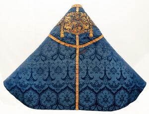 Der blaue Kunigundenmantel (DMB Inv.Nr. 3.1.0001) ist das älteste erhaltene liturgische Gewand mit einem die gesamte Fläche füllenden Bildprogramm. Er dürfte nach dem Vorbild Kaiserin Irmingards (gest. 851), die im 9. Jahrhundert einen Mantel mit einem Petruszyklus der Vatikanischen Basilika gestiftet hat, als Donation Kaiserin Kunigundes zu interpretieren sein. Das Pluviale zeigt Szenen zur Wiederkunft Christi sowie einen Petruszyklus. Die Umschriften greifen Antiphonen der entsprechenden Festtage auf. Vor allem durch die Szenen "Mose vor dem brennenden Dornbusch" und "Nero", dessen Leichnam von Wölfen zerrissen wird, ordnet sich das Programm in die Bildsprache Heinrichs II. ein. Die Ornamentik findet Parallelen in anderen Stiftungen des Kaiserpaares. Die Übertragung 1437-1441 wurde annähernd bestandserhaltend ausgeführt. Allerdings wurde der Mantel durch diese Übertragung und seine Restaurierung 1951-1953 um etwa 14 cm länger.