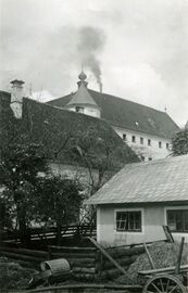 Rauchender Schlot in der Tötungsanstalt Hartheim, um 1940. Foto: Karl Schuhmann. (Dokumentationsstätte Hartheim)