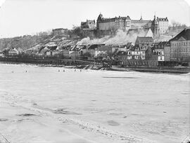 Blick von der Elbe auf Pirna mit der Tötungsanstalt Sonnenstein im Winter 1940. Foto: Hans Wunderlich. (© Deutsche Fotothek / Hans Wunderlich)