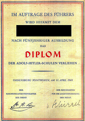 Möglich waren zwei Abschlüsse an den AHS: Das Abitur berechtigte zum Hochschulstudium; als höherwertig galt ein Abschluss mit "Diplom", das zusätzlich den weiteren Besuch von Parteischulen ermöglichen sollte, wie etwa die Ordensburg-Lehrgänge. Nach fünf Jahren AHS bat der älteste Jahrgang in Sonthofen um die Zulassung zum sog. Kriegsabitur und meldete sich geschlossen an die Front. Viele verloren dort ihr Leben. Im Herbst 1944 gab es vermehrt Wehrertüchtigung und Schanzeinsätze an allen AHS, gleichzeitig strebten zum Kriegsende hin die in den Gauen untergebrachten Schulen zurück nach Sonthofen, wo sich die Schüler auf mögliche Kampfeinsätze vorbereiteten. Zum Kriegsende gab es die letzten Opfer beim Kampfeinsatz vieler Schüler in Süddeutschland. Manche Schüler der AHS hatten nach dem Kriegsende Schwierigkeiten beim Versuch, wieder an ihre früheren Oberschulen in den Heimatorten zurückzukehren. Einige mussten ihre letzte Klasse wiederholen, andere wurden nicht angenommen. Gleichwohl machten viele ehemalige Schüler der AHS in der Nachkriegszeit beachtliche Karrieren. Exemplarisch seien hier die beiden späteren Schauspieler Wolfgang Grönebaum (1927–1998) und Eberhard "Hardy" Krüger (1928-2022) erwähnt. Theo Sommer (1930-2022) wurde für viele Jahre Herausgeber der Wochenzeitung "Die Zeit". Andere engagierten sich stark in der Versöhnungspolitik, wie etwa der Architekt Helmut Morlok (1929–2017).