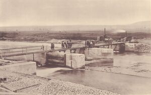 Die 1890 bis 1891 bei Bischberg (Lkr. Bamberg) errichtete Stauanlage im Main diente der Anhebung des Wasserspiegels in der Regnitz für die Schifffahrt. Das Foto zeigt die Bauarbeiten an Kammerschleuse, Floßgasse und linksseitiger Wehröffnung. Abb. aus: Bauwerke der Staats-Bau-Verwaltung in Bayern auf dem Gebiete des Straßen-, Brücken- und Wasser-Baues, München 1892, 21. (Bayerische Staatsbibliothek, 4 Don.Reg. 4 x)