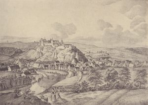 Harburg. Zeichnung von Braun, um 1830. Abb. aus: Das Bayerland, Jahrgang 32 vom Mai 1921, 265. (Bayerische Staatsbibliothek, 4 Bavar. 198 tb-32)