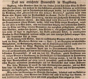 Einrichtungen, die nach der Idee der Parität geführt wurden, existierten in Bayern bereits im 19. Jahrhundert. Das "Frauenstift für höhere Stände" in Augsburg ist die älteste Einrichtung dieser Art auf bayerischem Boden und stammt aus dem Jahre 1835. Töchter aus großbürgerlichen Kreisen und verbürgerlichtem Adel besuchten diese Einrichtung. Den niedrigen Ständen (bäuerliche Landbevölkerung, Kaufmanns- und Handwerkerfamilien) war der Besuch nicht vergönnt. Trotzdem setzten sich die Besucherinnen des Frauenstifts für Menschen ein, die in Armut lebten.