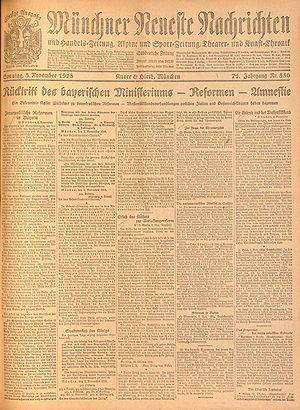 Artikel in den Münchner Neuesten Nahrichten mit der geplanten personellen Betzung des zukünftigen Ministeriums (Münchner Neueste Nachrichten Nr. 563 (7.11.1918), 1) (Bayerische Staatsbibliothek, 2 H.un.app. 47 h-1918,10-12)