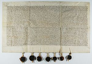 Nach dem Tod Pfalzgraf Rudolfs (reg. 1294-1317/19) 1319 regierten seine Söhne Ruprecht I. (reg. 1329-1390) und Rudolf II. (reg. 1329-1353) zuerst gemeinsam. Bereits am 3. Januar 1333 trafen die beiden Brüder allerdings Bestimmungen, die zwar nach wie vor eine gemeinsame Herrschaftsausübung vorsahen, jedoch die Einkünfte der Pfalzgrafschaft unter ihnen aufteilten. Als zumindest mitgestaltende Kräfte hinter diesem Vorgang wie auch der folgenden Teilung dürften die Räte der beiden Wittelsbacher gelten. Möglicherweise bedingt durch Konflikte innerhalb der Familie folgte der nächste Schritt. In einer am 18. Februar 1338 von Rudolf II. besiegelten Urkunde erklärte der Pfalzgraf die Untertanen mehrerer Herrschaftsbereiche ihrer Eide gegen ihn für ledig und verwies sie an Ruprecht I. und ihren gemeinsamen Neffen Ruprecht II. (reg. 1390-1398). Anders als in der älteren Forschung vermutet, ist dies keinesfalls der zentrale dispositive Vertrag, der am Ende des schlecht fassbaren Aushandlungsprozesses steht. Eine solche Urkunde dürfte ohnehin nicht existiert haben. Vielmehr ist davon auszugehen, dass "die Teilung selbst in einer Fortschreibung bereits bestehender Verhältnisse etabliert wurde" (Heimann, Hausordnung, 134).