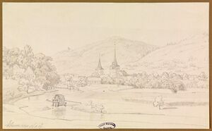 Der Bezirksarzt von Ebermannstadt (heute Lkr. Forchheim) Mathias Jaudt (1804-1877) schildert neben der Geschichte der Städte in seinem Bezirk auch das milde Klima und die Auswirkungen auf die Gesundheit. Die Zeichnung von Carl August von Lebschée (1800-1877) zeigt den Ort Ebermannstadt. (Staatsbilbiothek Bamberg, I T 135/38, lizenziert durch CC BY-NC 4.0)
