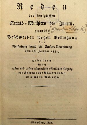 Titelblatt der Druckschrift: "Reden des königlichen Staats-Ministers des Innern, gegen die Beschwerden wegen Verletzung der Verfassung durch die Censur-Verordnung vom 28. Januar 1831", München 1831. In seinen Reden, die vor der Kammer der Abgeordneten im März 1831 gehalten wurden, verteidigte Eduard von Schenk, die Verfschärfung der Zensur. (Bayerische Staatsbibliothek, Bavar. 4268 l)