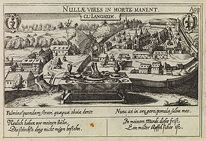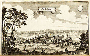Kloster Ebrach vor dem barocken Umbau. Hier fälschlicherweise als Gerolzhofen betitelt. Abb. aus: Martin Zeiller u. Matthaeus Merian, Topographia Franconiae, Frankfurt a. M. 1679, n. 42. (Bayerische Staatsbibliothek,Hbks/E 30-8/9 )