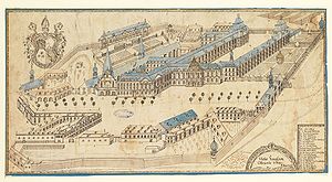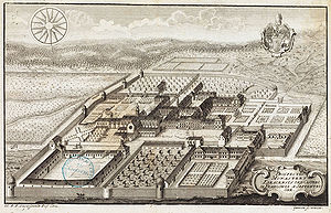 Kloster Ebrach nach dem barocken Ausbau des Klosters nach den Plänen von Johann Leonhard Dientzenhofer (1660-1707) zwischen 1688 und 1720. Kupferstich von R. P. Lucas Schmidt von 1738. (Staatsbibliothek Bamberg, HVG 23/81/1, Foto: Gerald Raab lizensiert durch CC-BY-SA 4.0)