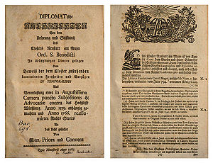 Der Ebracher Zisterzienserpater Eugen Montag (1741-1811), von 1791 bis 1803 letzter Abt des Steigerwaldklosters, veröffentlichte 1786 anonym eine Schrift zur "Frage: Ob der Abtey Ebrach in Francken das Prädicat Reichsunmittelbar rechtmäßig gebühre, und ob dieselbe als Herrschaft ihrer Unterthanen die Regel der Reichsfreyheit gegen die hochfürstl. Würzburgische Ansprüche einer vollkommenen Landeshoheit zu behaupten befugt seye?" Darin versuchte er eine historische Begründung für die reichsunmittelbare Position Ebrachs zu geben und die Streitfrage endgültig im Sinne der Ebracher Forderungen zu klären. Montag benutzte später als Prälat eine persönliche Titulatur, in der er sich als "abt und herr des unmittelbaren stifts" (Wüst, S. 186) bezeichnete. Die Angelegenheit geriet so wieder in einen juristischen Schwebezustand, der es wohl zur Vermeidung einer Rechtsunsicherheit geraten erscheinen ließ, Ebrach im § 2 des Reichsdeputationshauptschlusses nicht stillschweigend unter das Fürstbistum Würzburg zu subsumieren, sondern eigens unter den an Bayern fallenden (Reichs-)Abteien zu erwähnen. Ob damit aber von einer nachträglichen Erhebung in den Kreis der Reichsprälaten (Wüst, S. 196) oder nachträglichen Feststellung der Reichsunmittelbarkeit (Zimmermann, S. 82) gesprochen werden kann, erscheint allerdings als eine etwas überzogene Deutung.