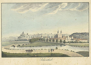 Kloster Schönthal, kolorierte Lithographie von Ambros Ganz, 1821. (Württembergische Landesbibliothek Stuttgart, Schef.fol.6912)