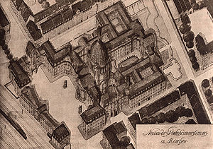 Zeichnung des Neubaus des Verkehrsministeriums aus der Vogelperspektive. Der Gebäudekomplex in der Arnulfstraße in München wurde im Zweiten Weltkrieg und in der Nachkriegszeit teilweise zerstört bzw. abgebrochen. Die Reste des ehemaligen Verkehrsministeriums in der Arnulfstraße 9/11/13 gehören heutzutage zur Bundesbahndirektion (aus: Bayerischer Architekten- und Ingenieurverein [Hg.], München und seine Bauten, München 1912, 524)