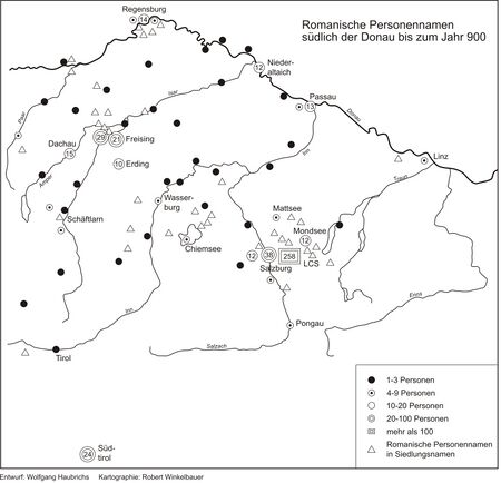 Diese Beispiele althochdeutschen Lautwandels des späten 7. und 8. Jahrhunderts deuten auf ein längeres Nebeneinander von romanischer und bairischer Sprache hin. Dafür spricht auch die über nahezu das gesamte Gebiet der Raetia Secunda und des westlichen Noricum, wenn auch in sehr unterschiedlichen Quantitäten, ausgebreitete Verteilung dieser Altnamen (Karte 1), wobei die Belegkonzentration in den Episkopalsitzen Freising, Regensburg, Passau und vor allem im von vorgermanischen Toponymen umgebenen Iuvavum-Salzburg gewiss auch deren zentrale Funktionen widerspiegelt. Was die chronologische Dimension der romanischen Personennamen angeht, scheint die Situation im 8. Jahrhundert zugunsten des 'germanischen' Namenbrauchs zu kippen. Eine so hohe Anzahl romanischer Namen wie in der ersten in Freising ausgestellten Urkunde von 743 findet sich später nicht mehr. Ebenso bleibt die erste, ins frühe 8. Jahrhundert zu datierende Passauer Urkunde mit ihrer Ausstellung in vico Fonalvae die consule und ihren völlig romanischen Agenten Mairanus, Dominicus, Dominicans, Floritus, Vigilus und dem Schreiber Quartinus, der auch ein qui escripsi mit romanischem Vokalvorschlag einflicht, singulär.