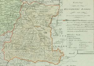 Auf der Grundlage der Konstitution des Königreichs Bayern ließ König Maximilian I. Joseph (1756-1825, ab 1799 Kurfürst, ab 1806 König) am 21. Juni 1808 eine "Territorial-Eintheilung" vornehmen, welche mit Wirkung vom 1. Oktober die vormalige Gliederung in Provinzen ablöste. Der Präambel der Konstitutionsverfügung zufolge sollte mit der Strukturierung etwa gleich großer Verwaltungsbezirke das Bedürfnis nach nahe gelegenen Zentralorten gedeckt werden. Tatsächlich erhoffte man sich unter Außerachtlassung historischer Grenzen eine beschleunigte Integration der seit 1805 zu verzeichnenden territorialen Neuerwerbungen sowie die Schaffung eines einheitlichen Untertanenverbandes. Staatsminister Maximilian Graf von Montgelas (1759-1838, Minister 1799-1817) hatte bereits seit dem Jahre 1796 eine derartige Verwaltungsreform vor Augen gehabt, um den Untertanen einen modernen bayerischen Staat als "gemeinsames Vaterland und einziges Interesse" anzubieten.