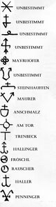 Die Brandzeichen auf den Reichenhaller Salzfässern zur Zeit des Salzpatriziats, 1459. Umzeichnung durch Erwin Henning, 1935, Zuordnung durch Johannes Lang.