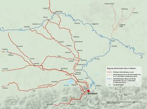 Von Traunstein aus versorgte man auf unterschiedlichen Routen, die sich auf Grund bestehender Niederlagsrechte im Verlaufe der Jahrhunderte nur mehr geringfügig änderten, den gesamten bayerischen Raum mit Salz. Über Rosenheim und Tölz wurde mit Hilfe des Saumhandels das unmittelbare Alpenvorland beliefert, während die wichtigste Salzstraße – die Ortsnamen „Halfurt“ und „Hallerschneid“ (beide Lkr. Rosenheim) deuten noch darauf hin – die großen Fuhrwerke über Wasserburg (Lkr. Rosenheim) nach München führte. Über Trostberg (Lkr. Traunstein) brachte man das Reichenhaller Salz aufwendig auf dem Landweg nach Neuötting (Lkr. Altötting) – ebenfalls eine Gründungsstadt der Wittelsbacher –, das sich seinerseits zu einer Drehscheibe für den Handel entwickelte. Während ein Weg über Altenmühldorf (Lkr. Mühldorf am Inn), Dorfen (Lkr. Erding) und Erding in Richtung München verlief, bediente ein anderer über Neumarkt-St. Veit (Lkr. Mühldorf am Inn) und Vilsbiburg (Lkr. Landshut) die Residenzstadt Landshut, um im weiteren Verlauf auch den Raum um Kelheim und Ingolstadt zu versorgen. Eine dritte Route schließlich führte über Massing (Lkr. Rottal-Inn) und Dingolfing (Lkr. Dingolfing-Landau) in Richtung Straubing und Regensburg. Bis ins 18. Jahrhundert herauf wurden auch die 1506 von Bayern an Tirol abgetretenen Gerichte Kitzbühel, Kufstein und Rattenberg durch bayerisches Salz versorgt.