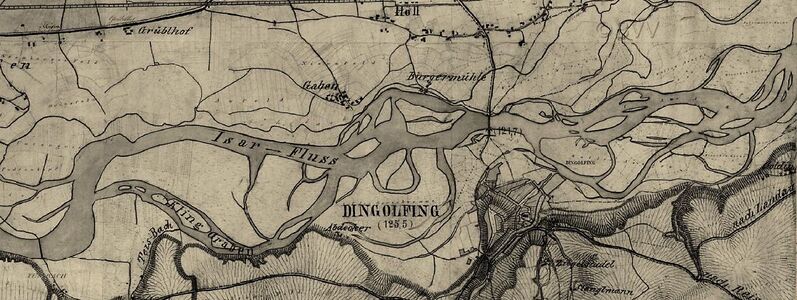 Die Isar bei Dingolfing um 1860. Beispiel eines unregulierten Wildflusses mit vielen sich verändernden Haupt- und Nebenarmen. (Geobasisdaten: Bayerische Vermessungsverwaltung, lizenziert durch CC BY-ND 3.0 DE)