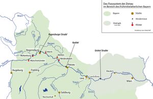 Die Donau, in der Spätantike noch Grenze des Römischen Reichs gegen Norden, entwickelte sich im frühen Mittelalter zu einer Hauptverkehrsachse des jungen bayerischen Herzogtums in west-östlicher Richtung, die dessen räumliche Ausdehnung vom Lech bis zur Enns und weiter nach Osten entscheidend förderte. Sie wurde nach Einmündung der Iller bei Ulm mit Booten befahrbar. Durch ihre Zuflüsse im Süden besaß sie Anschluss an den Alpenraum, im Norden an heute fränkisches bzw. oberpfälzisches Gebiet, den bayerischen Nordgau. Frühe bayerische Zentren lagen direkt im Einflussbereich des Stromes wie Regensburg und Passau. Flussaufwärts und dazwischen entstanden bereits im 8. Jh. mit Münchsmünster (Lkr. Pfaffenhofen a. d. Ilm), Weltenburg (Lkr. Kelheim), Wörth a. d. Donau (Lkr. Regensburg), Metten (Lkr. Deggendorf) und Niederaltaich (Lkr. Deggendorf) eine Reihe von Klöstern. Sie verdichteten u.a. durch den Betrieb von Fähren, Umladestationen/Stapeln oder Herbergen die Infrastruktur am Strom. Auch entferntere Zentren strebten nach einem direkten Donauzugang wie Freising, das 856 einen Donauhafen mit Schiffsrechten bei Lengfeld südwestlich von Bad Abbach (beide Lkr. Kelheim) eintauschte (Traditionen des Hochstifts Freising 758). So erwies sich die Donau mit ihren Zuflüssen für die Ausbildung des frühmittelalterlichen Bayern von enormer wirtschaftlicher, politischer und kultureller Bedeutung.