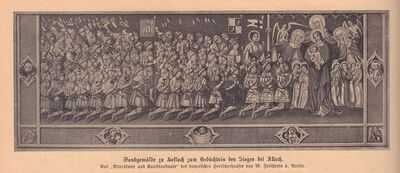 "Herzog Ernst rettet seinem Sohne Albrecht das Leben im Treffen bei Alling". 1422. Wandbild im Gebäude des 1867 eröffneten Bayerischen Nationalmuseums. (aus: Karl von Spruner Die Wandbilder des Bayerischen National-Museums. Band IV, München, 1868, Tafel 38. Abbildung aus dem Exemplar, das König Ludwig II. der Bayerischen Staatsbibliothek schenkte. [BSB Rar. 106])