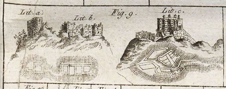 Zeichnung der Burg Schwangau, um 1830 (links; Lit. a u. b). (Abb. aus: Johann von Raiser, Der Ober-Donau-Kreis des Königreichs Bayern unter den Römern. 1: I. Abth.: Die Römer-Male von Augusta rauracum bis Augusta Vindelicorum, 1830, 111, Fig.9.)