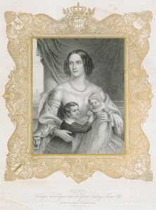 Königin Marie von Bayern (1825-1889) mit den Prinzen Ludwig und Otto (1848-1916). Lithographie von Thomas Driendl (1807-1859), um 1850. (Bayerische Staatsbibliothek, Bildarchiv port-00621)