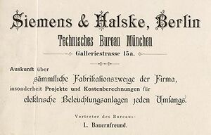 Doch dieser Absatzweg war nicht ideal: Als ungünstig bei dem „Vertretergeschäft“ erwies sich die mangelnde Kundennähe; vor allem fehlte es an wichtigen Rückmeldungen über die Qualität der Produkte und die geleisteten Installationsarbeiten. Vorrangiges Ziel war es seit 1885 daher, ein dichtes Netz eigener Vertriebsstellen, sog. Technischer Büros, zu schaffen, die engen Kontakt zum Kunden herstellen und umfassende Beratungs- und Planungsdienstleistungen anbieten sollten. Das erste dieser Technischen Büros richtete Siemens 1890 in München ein, viele weitere folgten im In- und Ausland. Zum Leiter dieser ersten Geschäftsstelle wurde der Ingenieur Adalbert Planck (1852–1930) berufen, ein Bruder von Max Planck (1858–1947, Nobelpreis für Physik 1918). Dass sich der Aufwand einer eigenen Vertretung in München lohnte, zeigen die Umsatzzahlen der ersten Geschäftsjahre, die sich von 1890 (1.350 Mark) bis 1894/95 (179.000 Mark) vervielfachten. Mit dem Bau der ersten städtischen „Drehstromzentrale“, wie Elektrizitätswerke damals genannt wurden, in Erding konnte das Technische Büro München 1892 einen beachtlichen Großauftrag verbuchen.