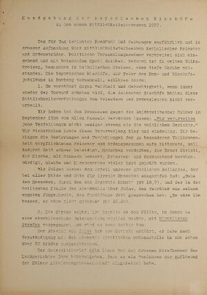 Die eigentlichen Prozesse, die vor den Landgerichten geführt wurden, begannen im Mai 1936. Im Juli desselben Jahres kam es auf Weisung Adolf Hitlers (NSDAP, 1889–1945, Reichskanzler 1933–1945) mit Rücksicht auf die Olympischen Sommerspiele in Berlin und den spanischen Bürgerkrieg, die beide zu einer temporären Pazifizierung zwischen katholischer Kirche und NS-Staat geführt hatten, zu einer ersten Aussetzung der Verfahren. Im April 1937 wurden sie nach der Veröffentlichung der Enzyklika „Mit brennender Sorge“ von Papst Pius XI. (1857–1939, Papst 1922–1939) temporär wieder aufgenommen. Die Enzyklika, welche die NS-Ideologie verurteilte, wurde vom NS-Regime als Kampfansage aufgefasst. Die Untersuchungshaft vieler Beschuldigter verlängerte sich durch diese Unterbrechung erheblich. Bereits Ende Juli 1937 wurde jedoch eine weitere Verhandlungssperre angeordnet.