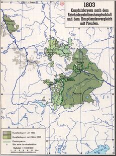 Kurpfalzbayern nach dem Reichsdeputationshauptschluss und dem Hauptlandesvergleich mit Preußen 1803. (aus: Max Spindler [Hg.], Bayerischer Geschichtsatlas, München 1969, 36)