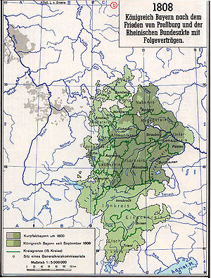 Dennoch hatte es Bayern als Verbündeter Napoleons geschafft, ein großer Flächenstaat zu werden, dessen Territorium nicht nur eine starke Erweiterung erfuhr, sondern auch Geschlossenheit erreichen konnte: Rund um das altbayerische und oberpfälzische Stammland wies das Königreich Erweiterungen nach Ober- und Mittelfranken, nach Schwaben und Vorarlberg bis Tirol und Salzburg auf. Lediglich nach Osten in Richtung des habsburgischen Böhmens war der ursprüngliche Grenzverlauf unverändert geblieben.