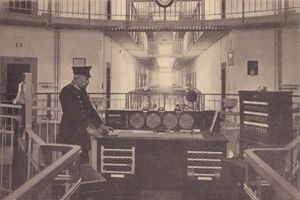 Der Oberwachtmeister auf der Kanzel der Zentrale des Zellenbaues. Abb. aus: Das Bayerland, Jahrgang 37 vom März 1926, 165. (Bayerische Staatsbibliothek, 4 Bavar. 198 t-37)