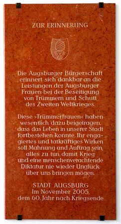 Gedenktafel der Stadt Augsburg an die Trümmerfrauen, 2005. (Foto: Sammlung Häußler, Augsburg)
