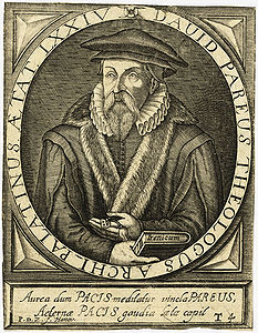 Die Publizistik und Lehre des Heidelberger Theologen David Pareus (1548-1622) zog viele Studenten aus den reformierten Ländern an. Seine Schrift "Irenicum" (1614), in der er die Gegensätze zwischen Luthertum und Calvinismus abschwächen wollte, war exemplarisch für die vermittlungstheologischen Tendenzen der Heidelberger Lehre. (Kupferstich um 1650 von Paul de Zetter, Digitaler Portraitindex obj 33206557)]]
