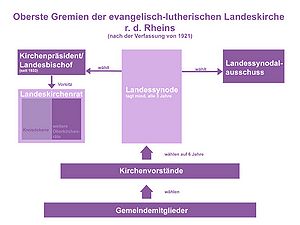 - die Art der Leitungsorgane generell ist das Bedürfnis nach einer persönlichen Führungsfigur in allen Ländern stark ausgeprägt. In einigen Ländern gibt es neben dem Bischof ein kollegiales Leitungsorgan. Dieses ist aber nur in Bayern identisch mit der obersten Verwaltungsbehörde (Landeskirchenrat). Das Spektrum der Leitungsmacht, die der Synode eingeräumt wird, reicht von umfassend in reformierten deutschen Landeskirchen bis zur eingeschränkteren Bedeutung in Bayern. Hier wird die Synode als Vertretung der Kirchengemeinden zwar als oberstes Organ, aber quasi als Gegenüber der eigentlichen Leitungsorgane Kirchenpräsident und Landeskirchenrat betrachtet.